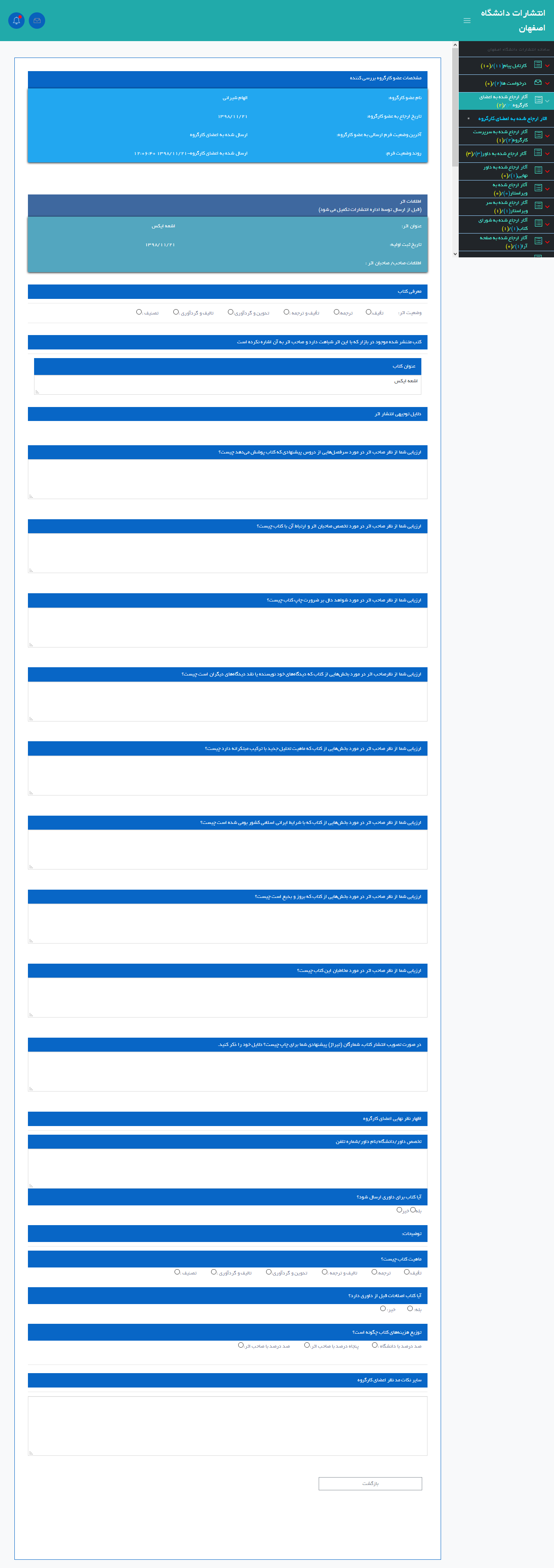 شامل جدول هوشمند و جستجوی هوشمند بر روی تمام ستون های جدول ونمایش تعدادکل آثار ارجاع شده به سرپرست کارگروه به همراه تعدادآثار ارجاع شده به سرپرست کارگروه جدید و آثار ارجاع شده به اعضای کارگروه دراین جدول آثاری که اعضای کارگروه ارجاع شده است نمایش داده می شود وبا انتخاب آن اثر میتوان آن اثر را مشاهده کرد