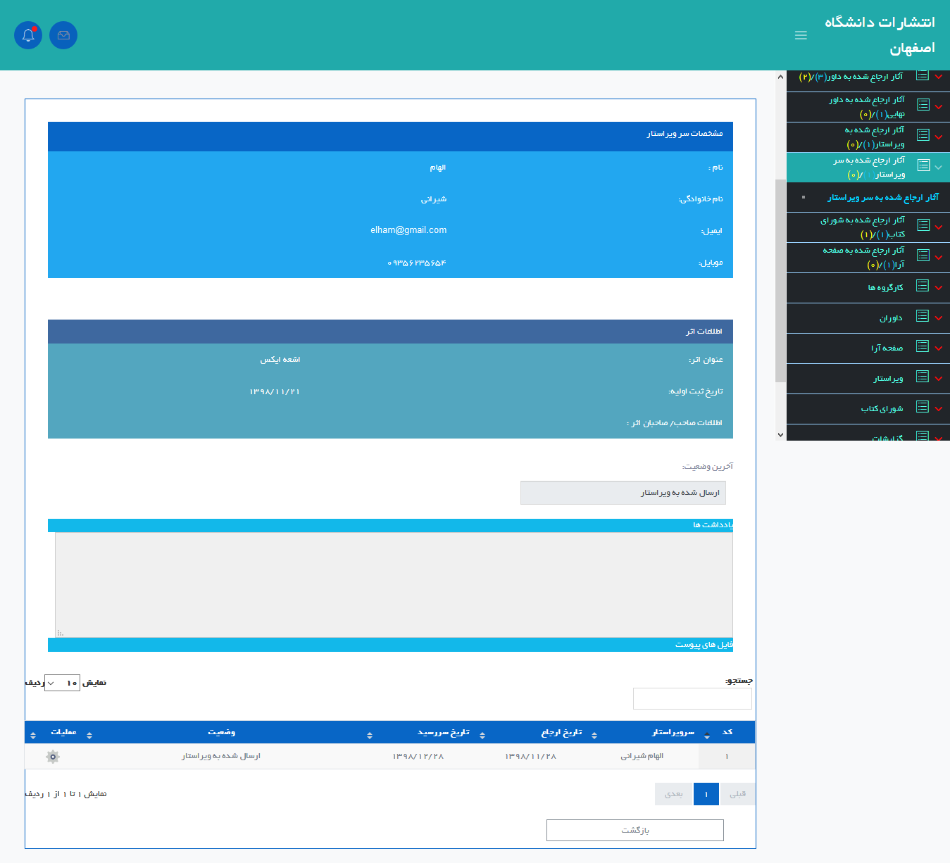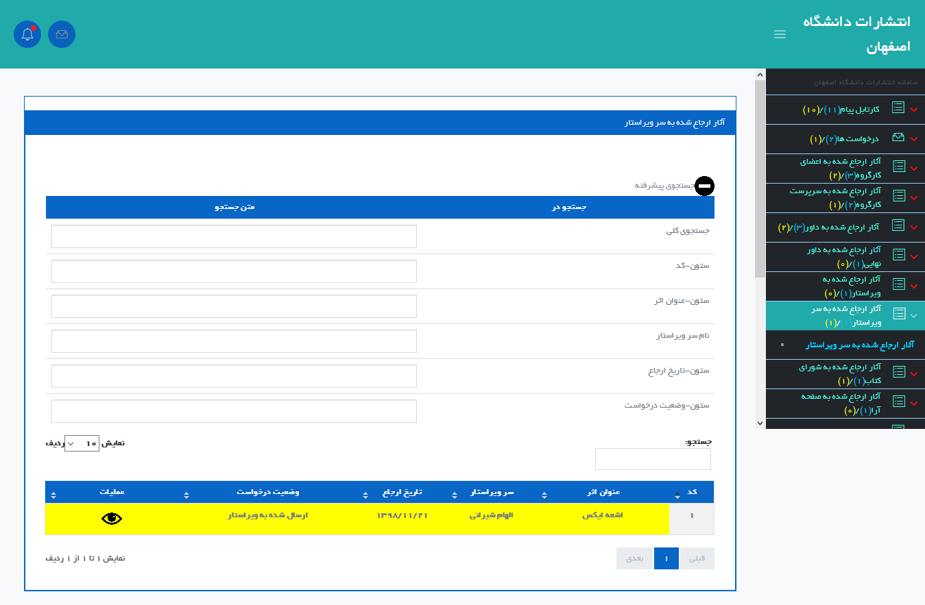 شامل جدول هوشمند و جستجوی هوشمند بر روی تمام ستون های جدول ونمایش تعدادکل آثار ارجاع شده به داورنهایی به همراه تعدادآثار ارجاع شده به داورنهایی جدید و آثار ارجاع شده به سر ویراستار دراین جدول آثاری که سر ویراستار ارجاع شده است نمایش داده می شود وبا انتخاب آن اثر میتوان آن اثر را مشاهده کرد