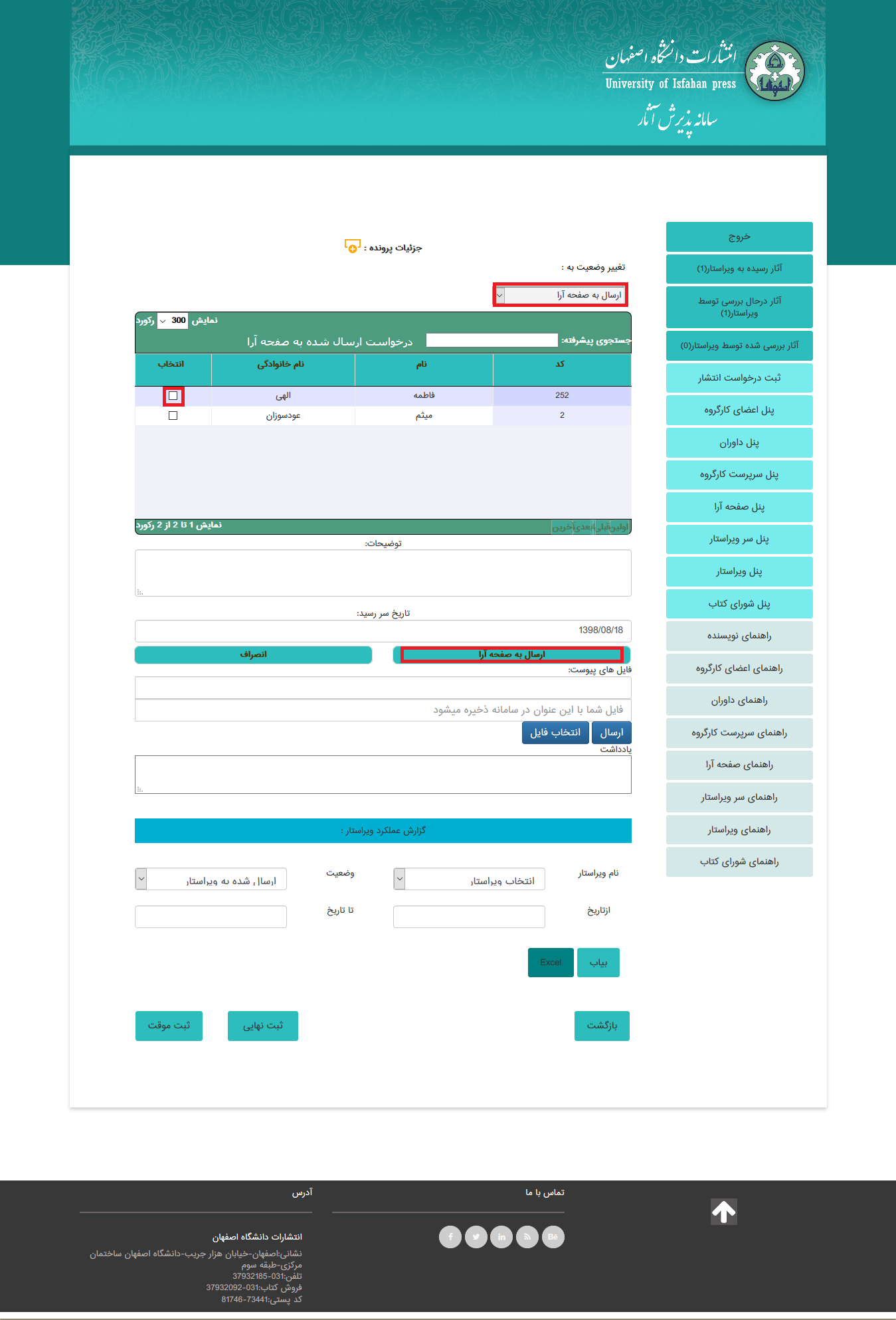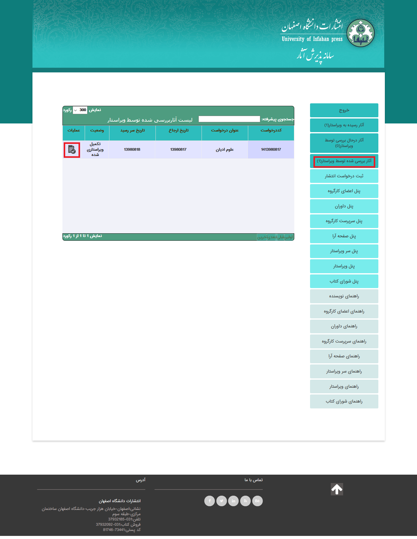 دراین حالت شامل جدولی با جستجوی هوشمند است که اثری که به این ویراستار رسیده نمایش می دهد